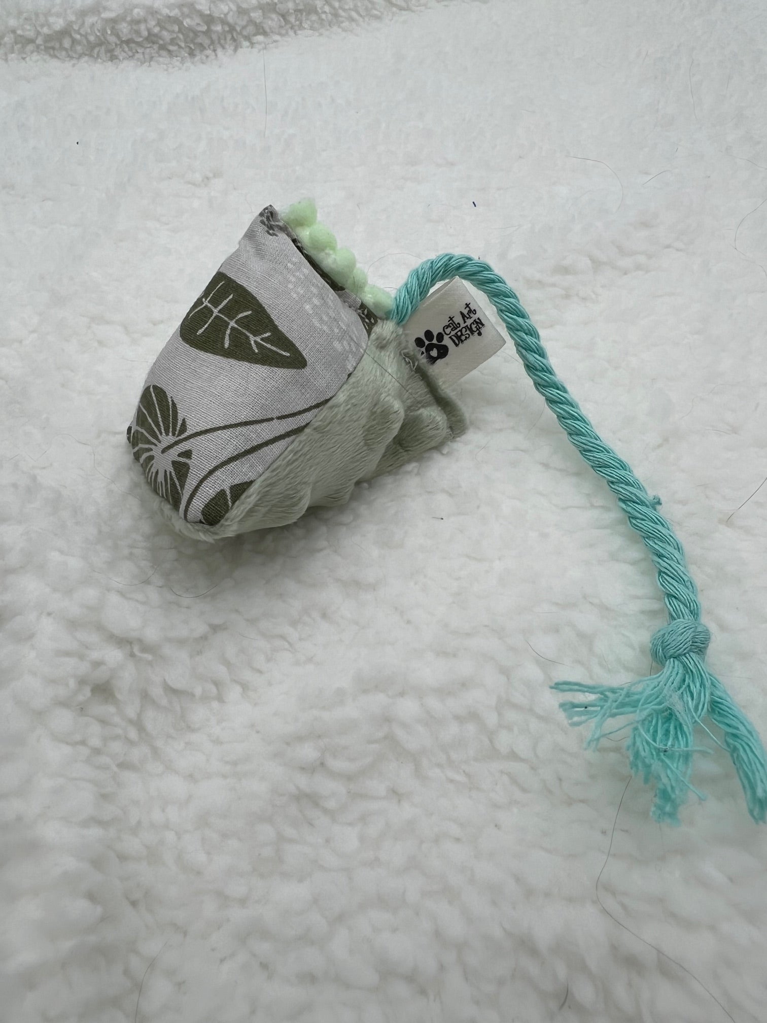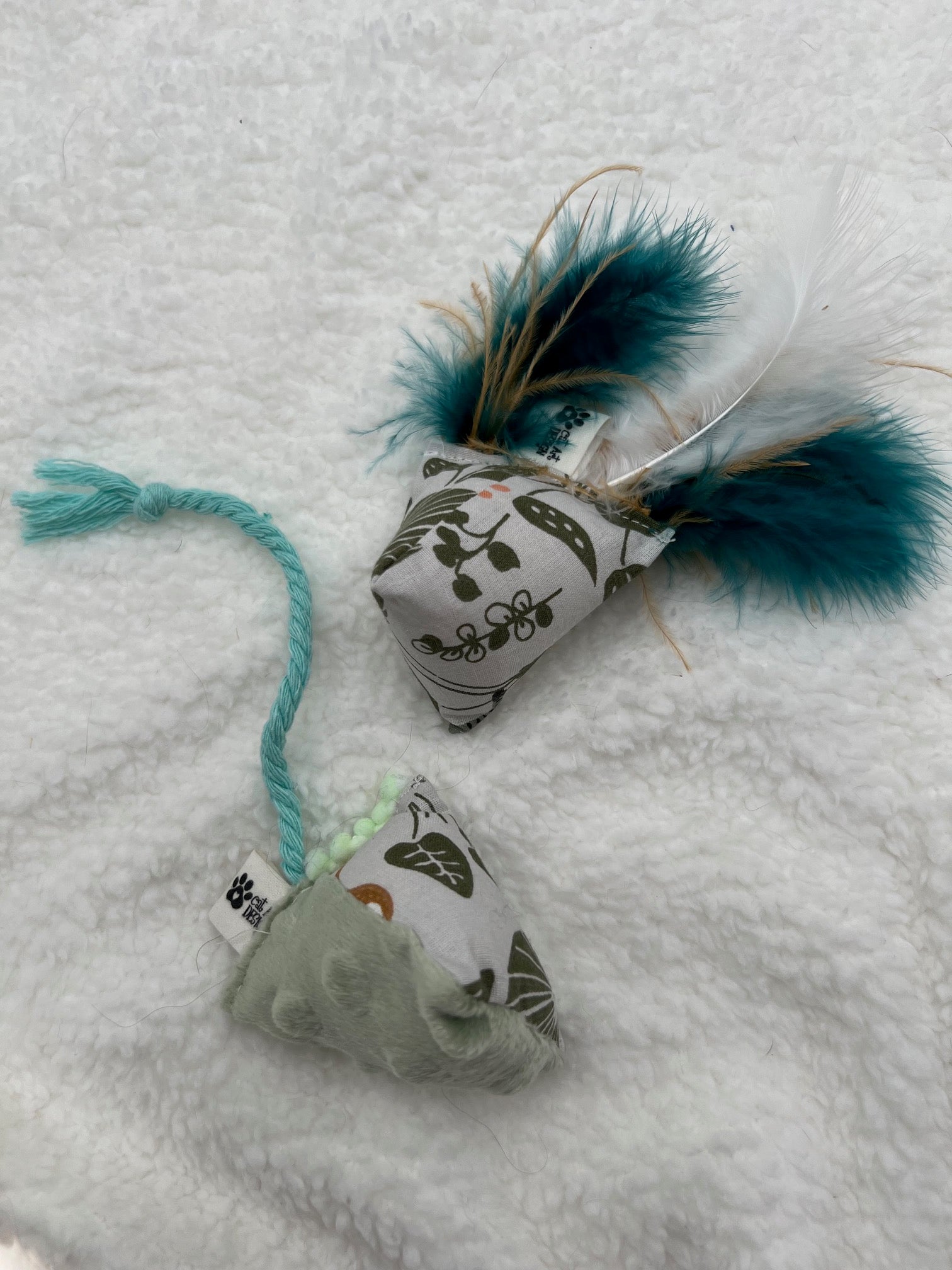 Deux petits jouets en forme de berlingot, pensés pour varier les textures, les sons et les mouvements afin de maintenir l’attention et l’enthousiasme de votre félin.