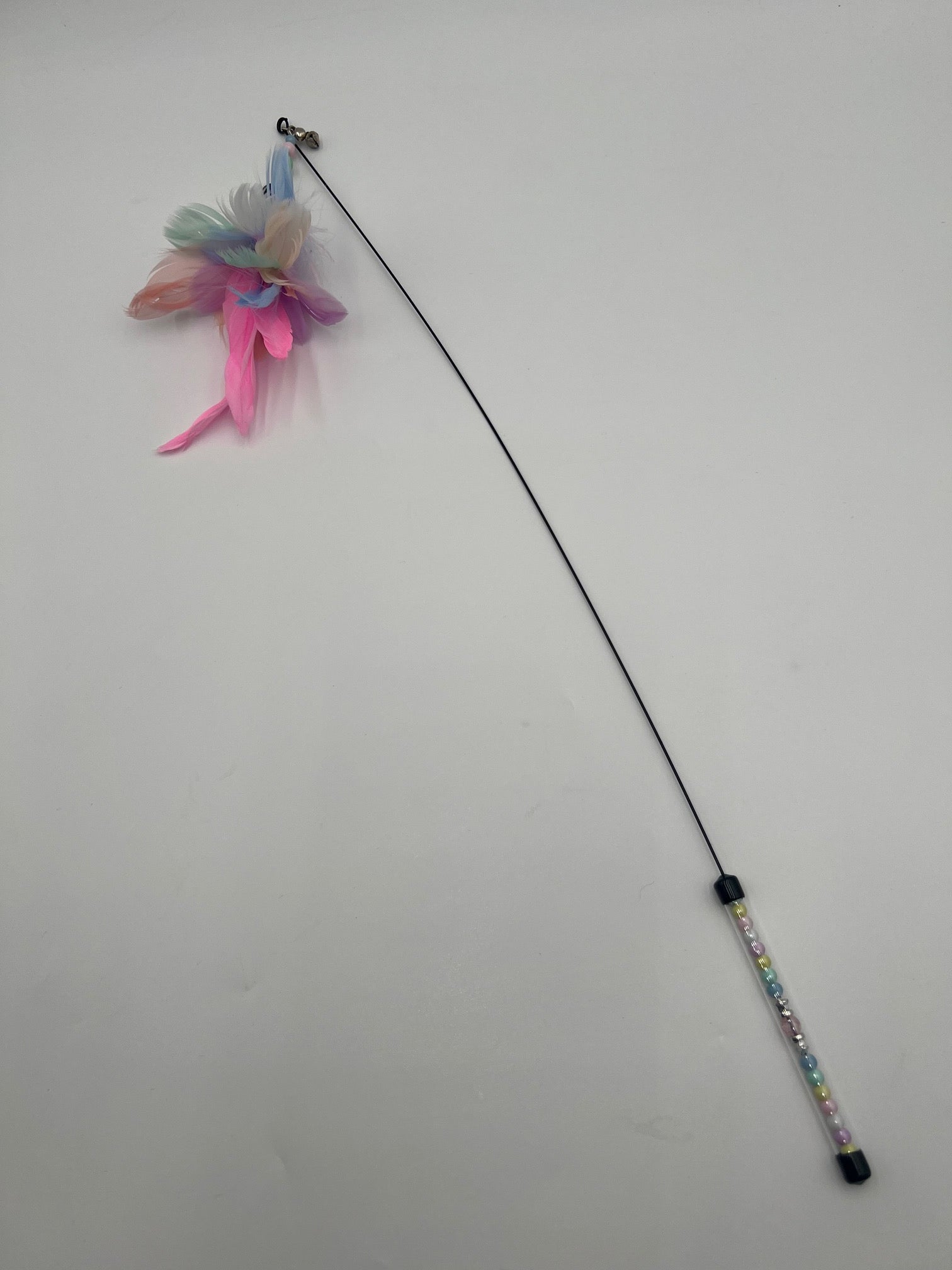 Avec son look de canne à pêche, le Plumeau Swing allie élégance et mouvement. Son manche en perles et sa longue tige métallique souple qui donne une amplitude de jeu irrésistible. À son extrémité, une tête spéciale mêlant perles, grelot et plumes naturelles capte l’attention du chat et réveille son instinct de chasseur.
