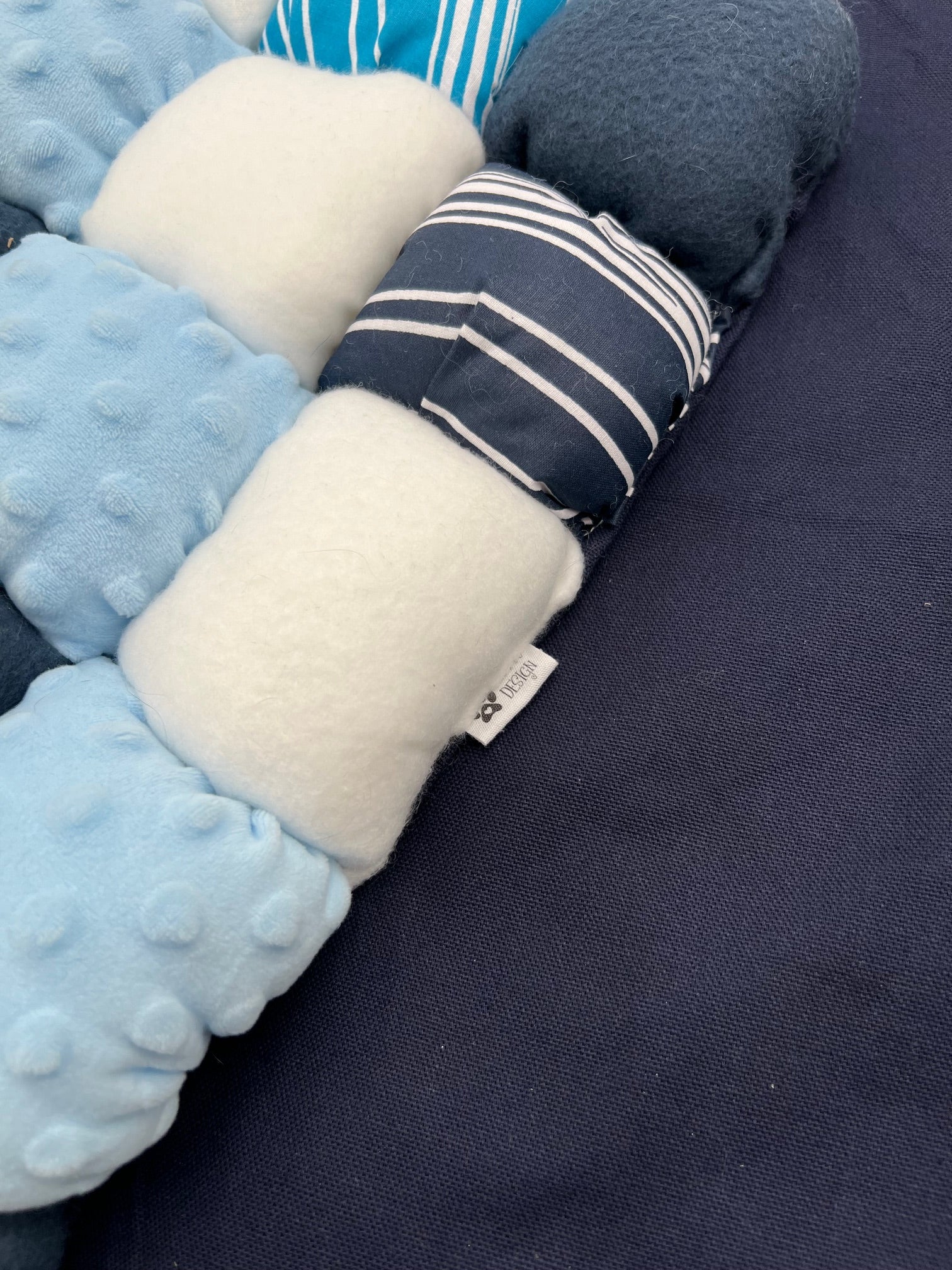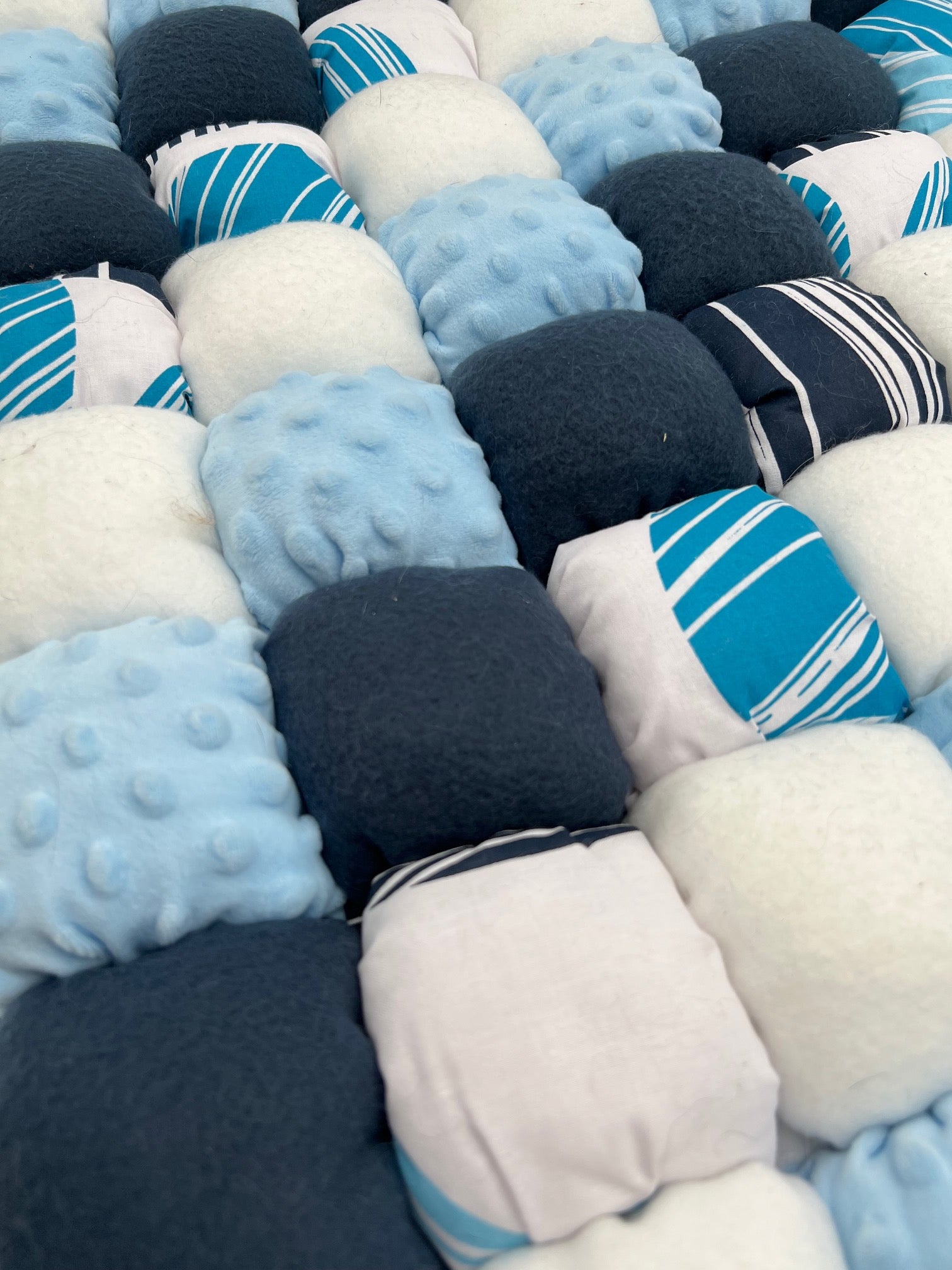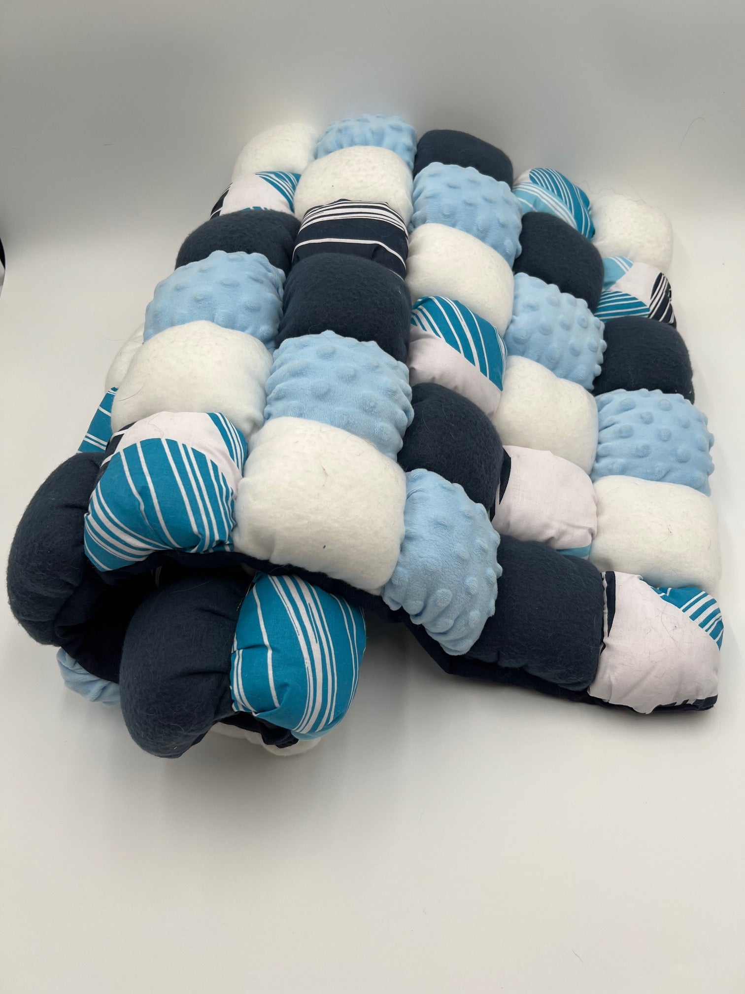 - Matière & Coloris : coton Bulle bleue / Minky bleu ciel / polaire bleu marine