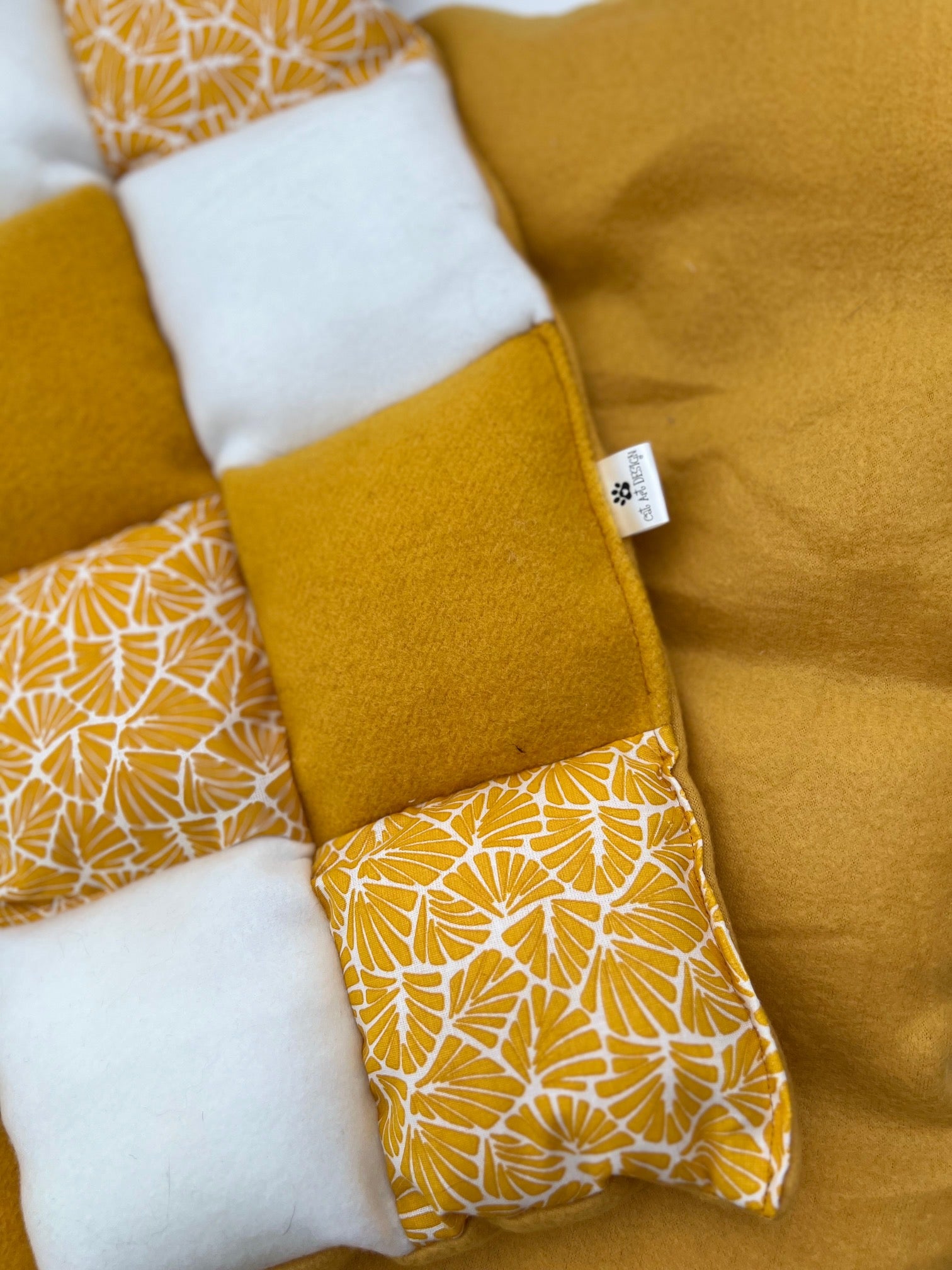 - Matière & Coloris : coton antibe jaune / velours de laine jaune / polaire blanche