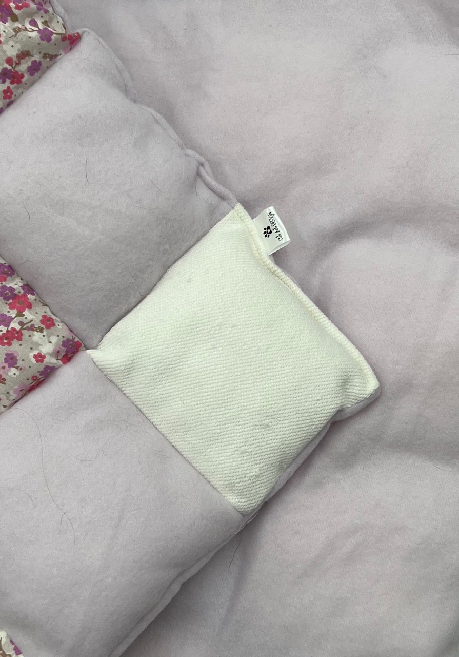- Matière & Coloris : coton liberty rose / polaire lilas / blanc