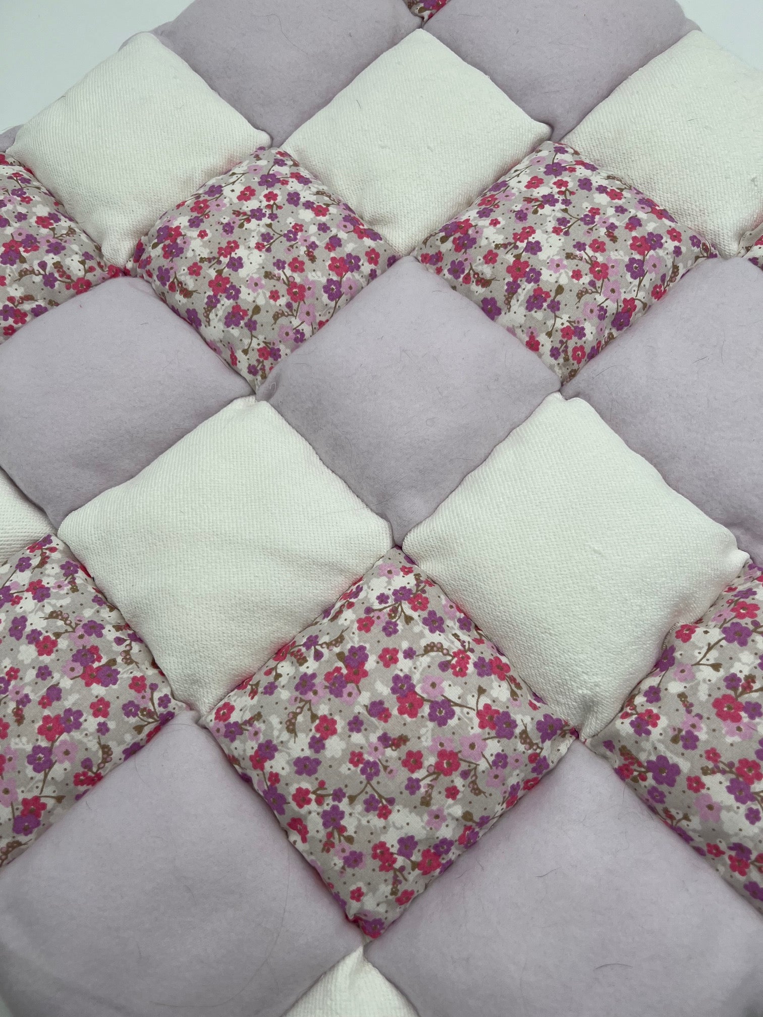Réalisé en patchwork de petits carrés rembourrés, aux couleurs assorties, il offre une épaisseur de 2 à 3 cm idéale pour créer un espace douillet, protecteur et élégant.