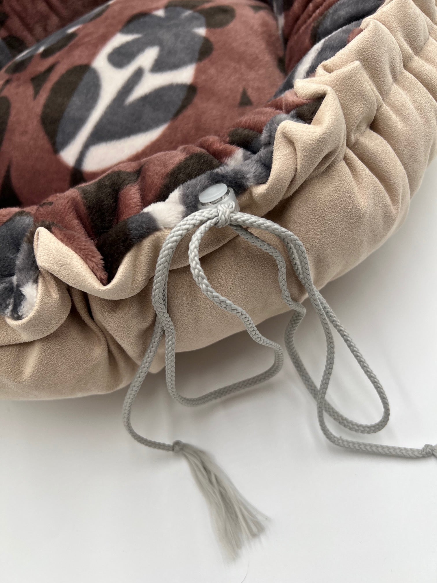 - Matière & Coloris : polaire marron fleur grise / suédine écru